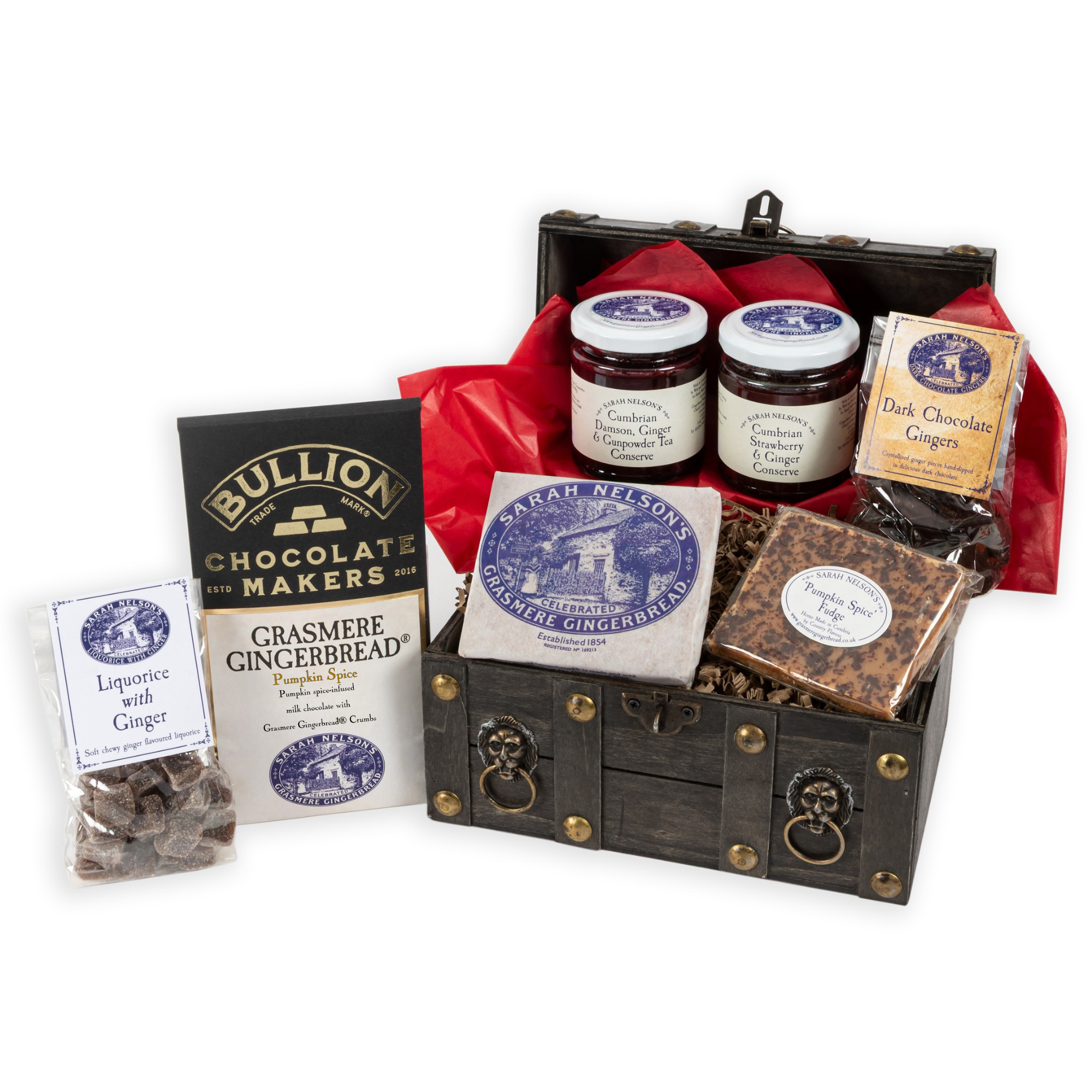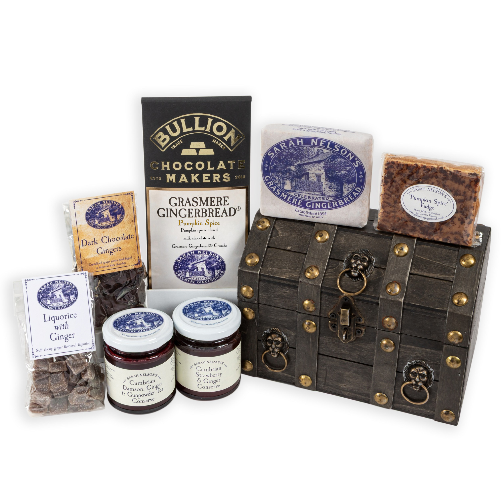 Rising up out of this gothic horror-inspired chest box are a six piece packet of freshly baked Grasmere Gingerbread®, a jar of explosive Damson, Ginger & Gunpowder Tea Conserve, devilishly delicious dark chocolate gingers, our brand-new milk chocolate bar infused with pumpkin spice and Grasmere Gingerbread® Crumbs and much more…