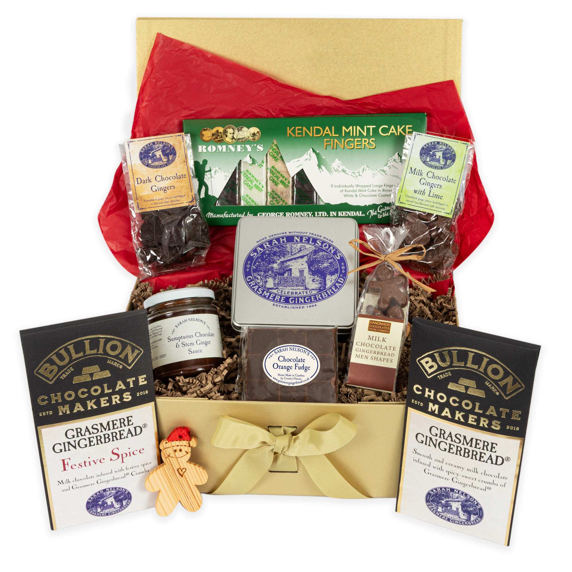 This golden selection contains a king’s ransom of artisanal treats including a six-piece presentation tin of freshly baked Grasmere Gingerbread®, two exclusive Bullion milk chocolate bars (our classic Grasmere Gingerbread® Crumbs bar and new Festive Spice- infused chocolate bar), handmade dark chocolate gingers and milk chocolate limes, delicious chocolate orange fudge, milk chocolate gingerbread men shapes and a jar of sumptuous chocolate & stem ginger sauce. Pure indulgence.