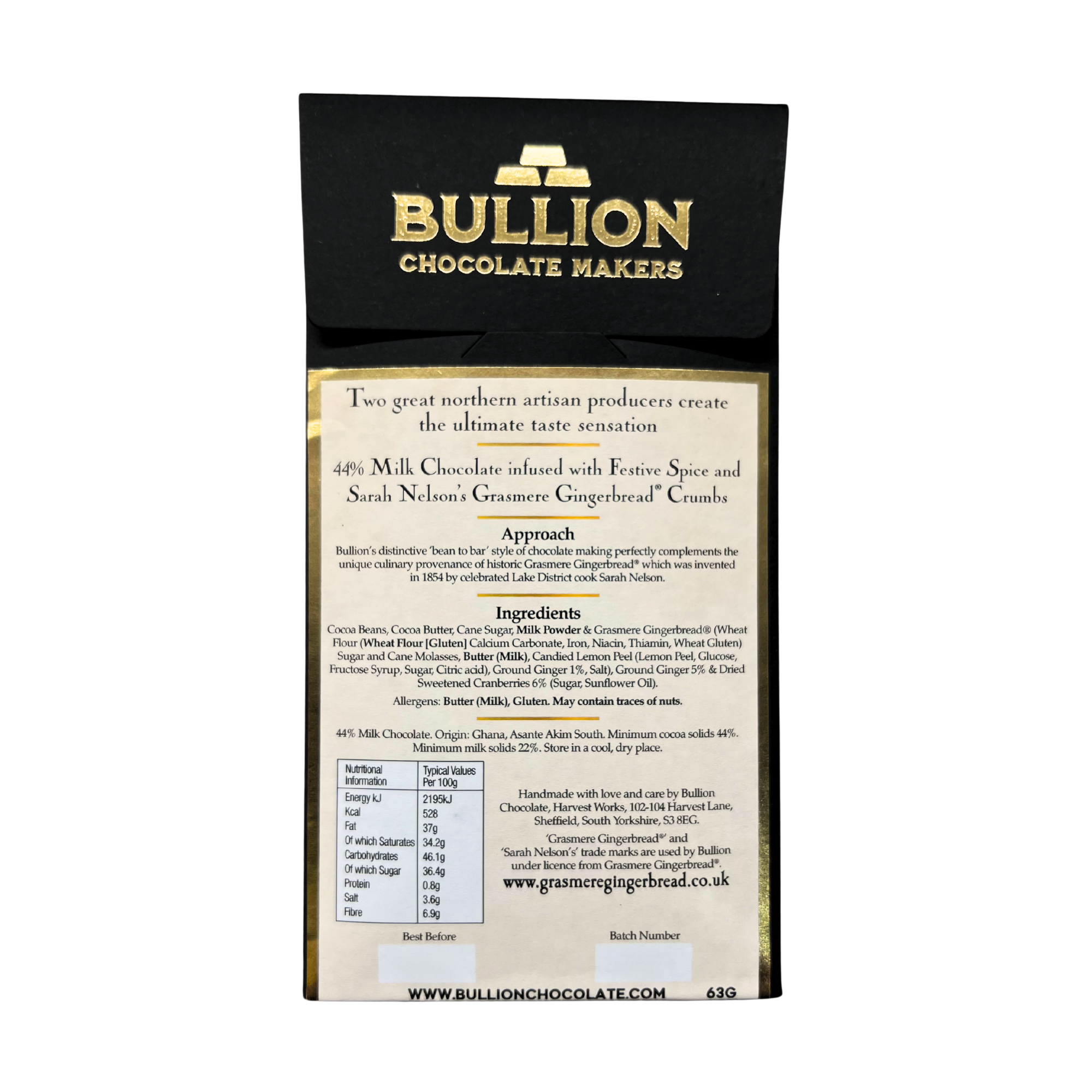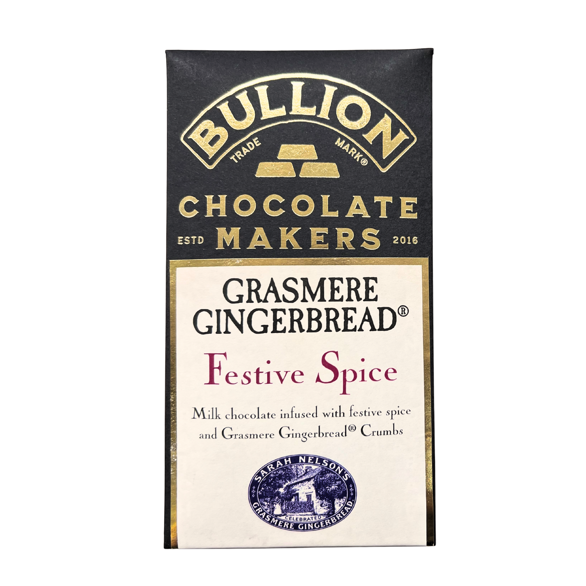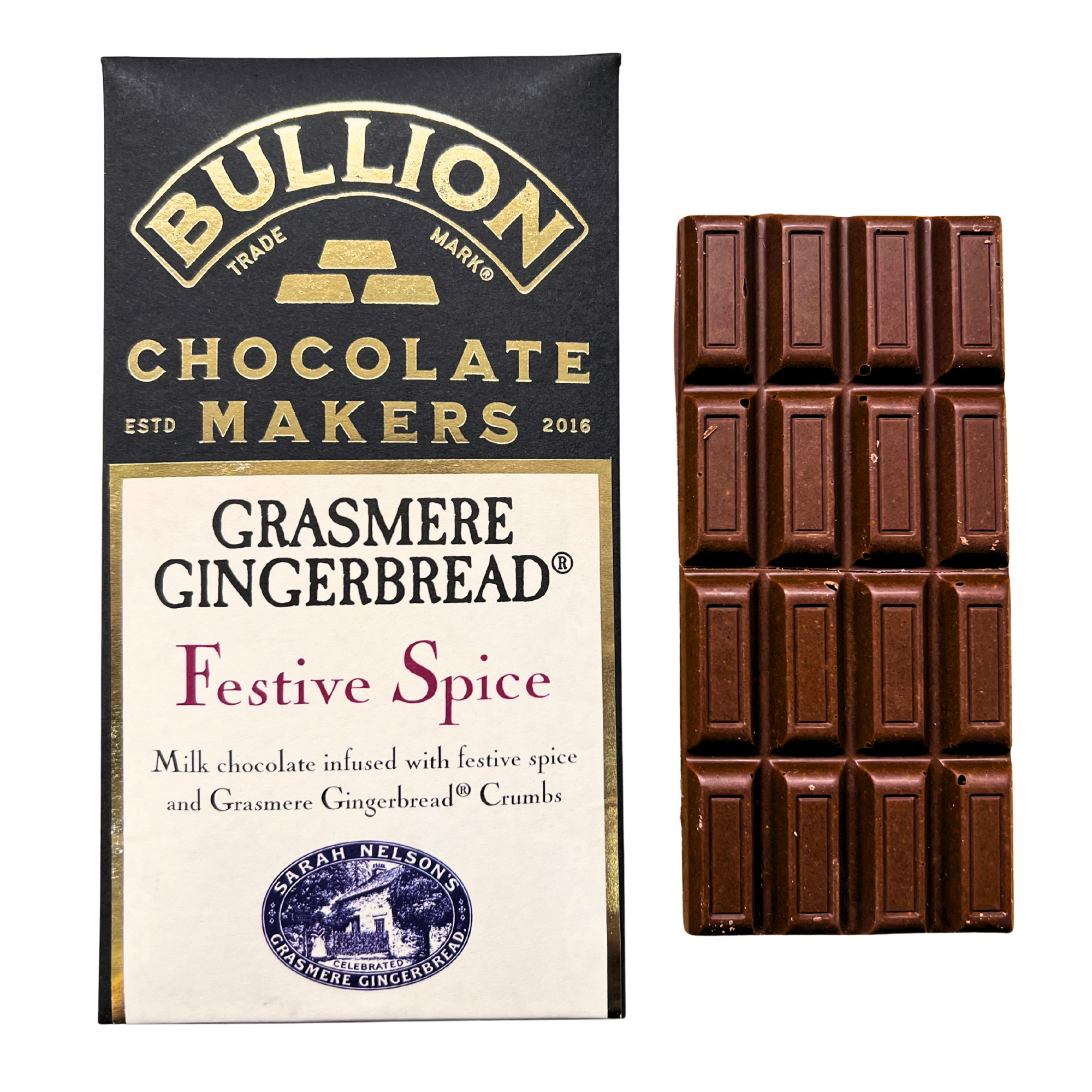 Handmade by Bullion Chocolate of Sheffield, this distinctive ‘bean to bar’ craft milk chocolate incorporating Grasmere Gingerbread® crumbs and festive spice is chocolate at its most luxurious.