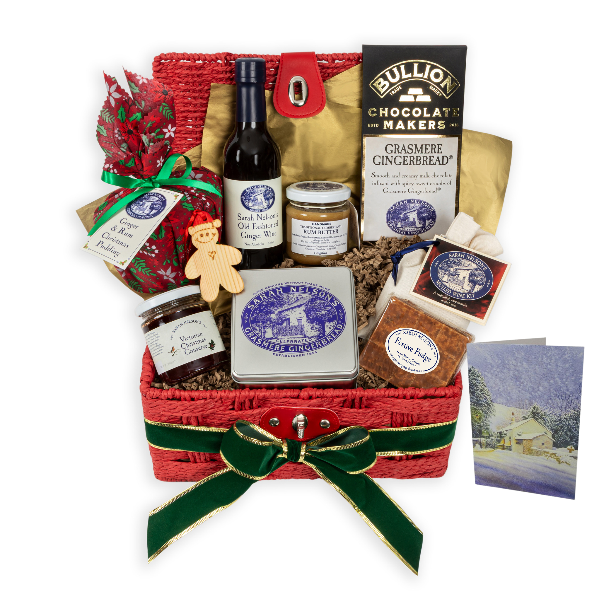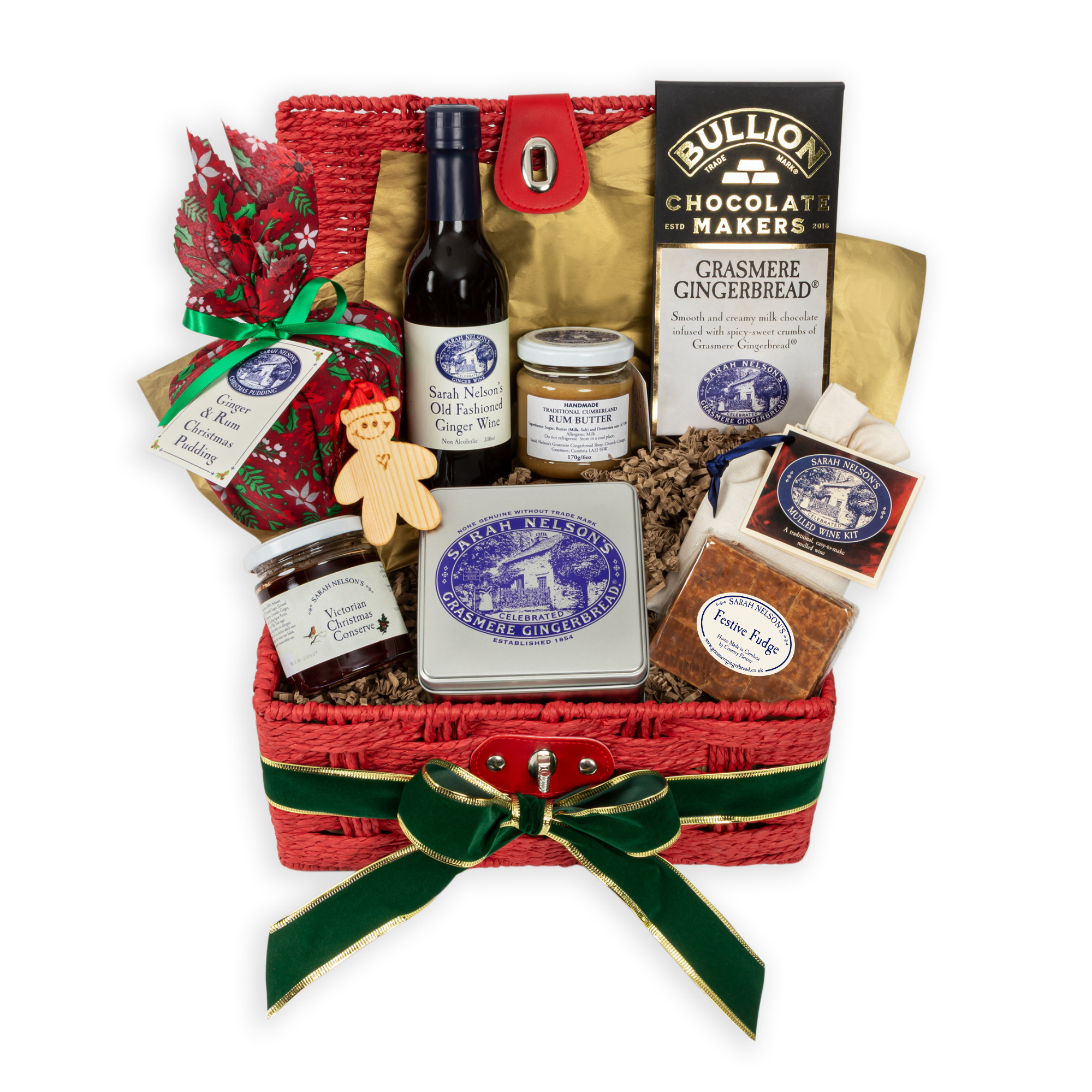 Presented in an attractive red seasonal hamper dressed with ivy green ribbon and gold tissue, this classic collection of Christmas goodies includes a mouth-wateringly moist Sarah Nelson Ginger & Rum Christmas Pudding. It’s the perfect family self-gift but equally suitable to send to a treasured relative or special friend.