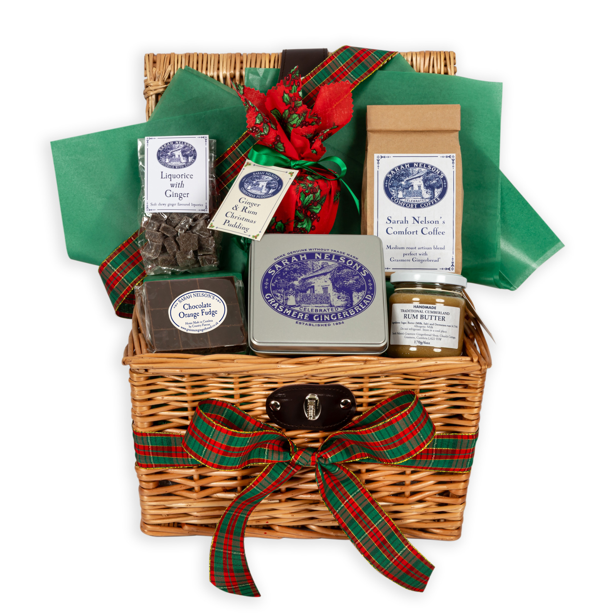 Inside a wicker hamper bound with traditional Christmas check ribbon are a six-piece presentation tin of spicy-sweet Grasmere Gingerbread®, a bag of freshly roasted artisanal coffee (as served in the shop), a small rum & ginger Christmas pudding, a jar of handmade traditional Cumberland Rum Butter, and delicious confectionary. It is the perfect Christmas gift for coffee lovers…