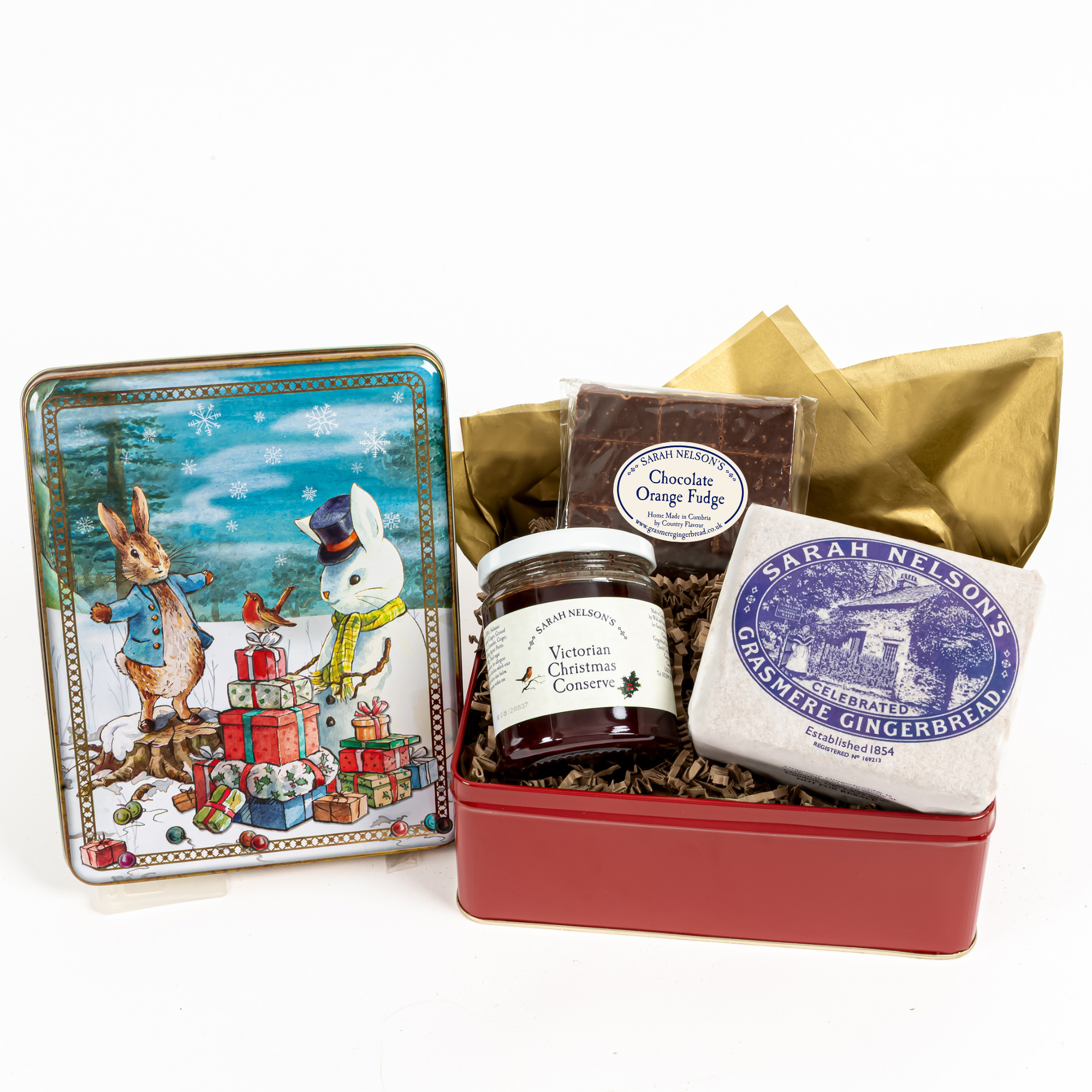 Treat your family, a loved relation or valued friend over Christmas with the mouth-watering contents of this delightful keepsake tin featuring Beatrix Potter’s timeless Peter Rabbit in a snowy festive scene. A delicious twelve-piece packet of freshly baked Grasmere Gingerbread®, a bar of Sarah Nelson’s Chocolate Orange Fudge and a jar of Sarah Nelson’s Victorian Christmas Conserve are presented in seasonal gold tissue.