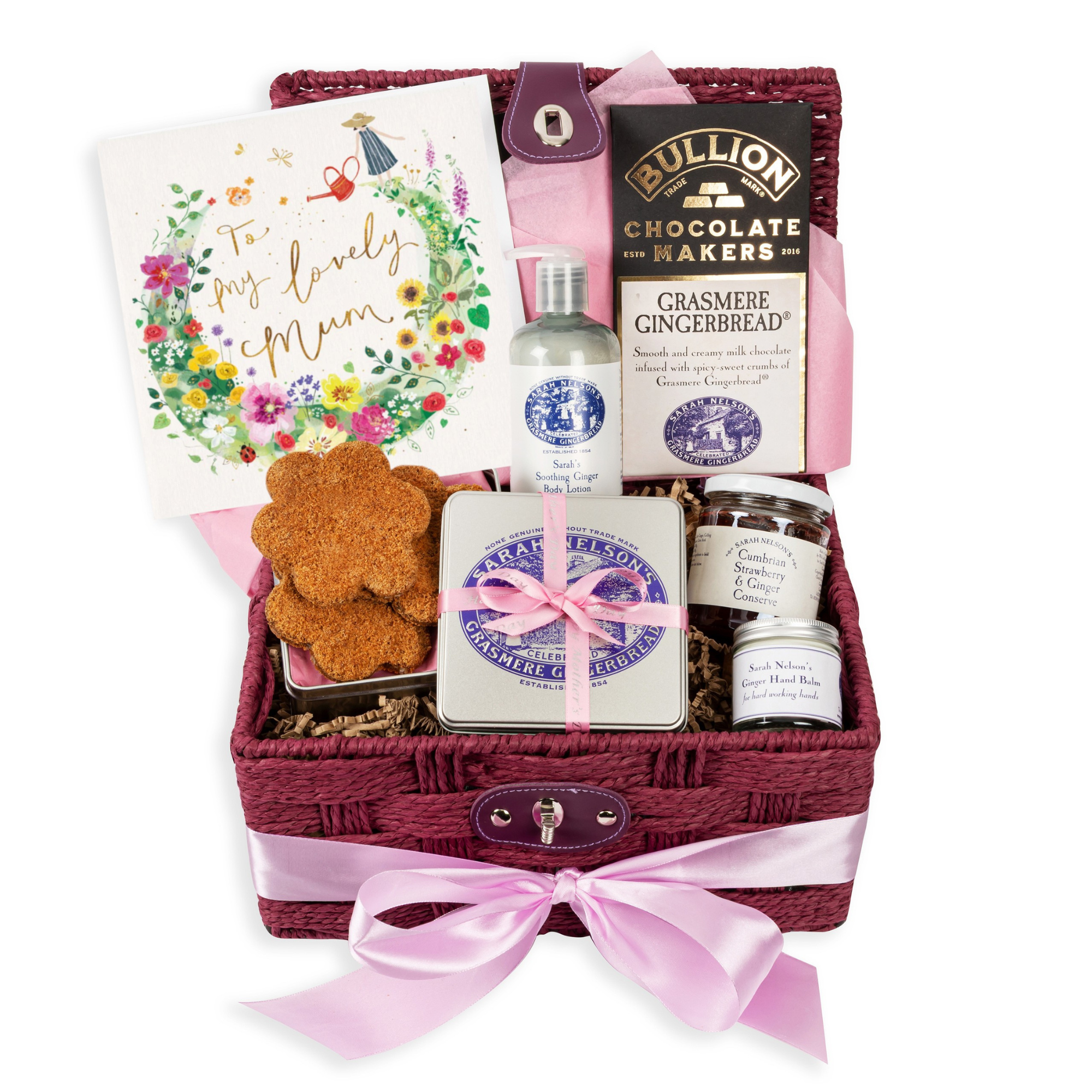 Presented in a stylish plum-coloured rope hamper and dressed with pink satin ribbon and tissue, this unique Mother’s Day gift includes 3 flower-shaped pieces of freshly baked Grasmere Gingerbread® inside a keepsake presentation tin, a luxury bar of Grasmere Gingerbread® crumb infused craft chocolate, a jar of delicious strawberry & ginger conserve, soothing ginger body lotion and moisturising ginger hand balm.